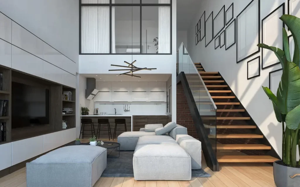 Para empezar, debemos de conocer primero qué son los departamentos dúplex. Como mencionamos al principio, es una vivienda que se distribuye en dos pisos, generalmente con áreas comunes como la sala de estar, la cocina y el comedor en el nivel inferior, mientras que los dormitorios y baños se ubican en el nivel superior. Esta disposición permite una separación clara entre las áreas sociales y las privadas, lo que contribuye a una mayor privacidad y confort interconectados por la escalera interna.